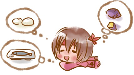 そして全然関係ない落書き。秋の味覚に思いを馳せる4様。あれ…?饅頭って秋の味覚…?